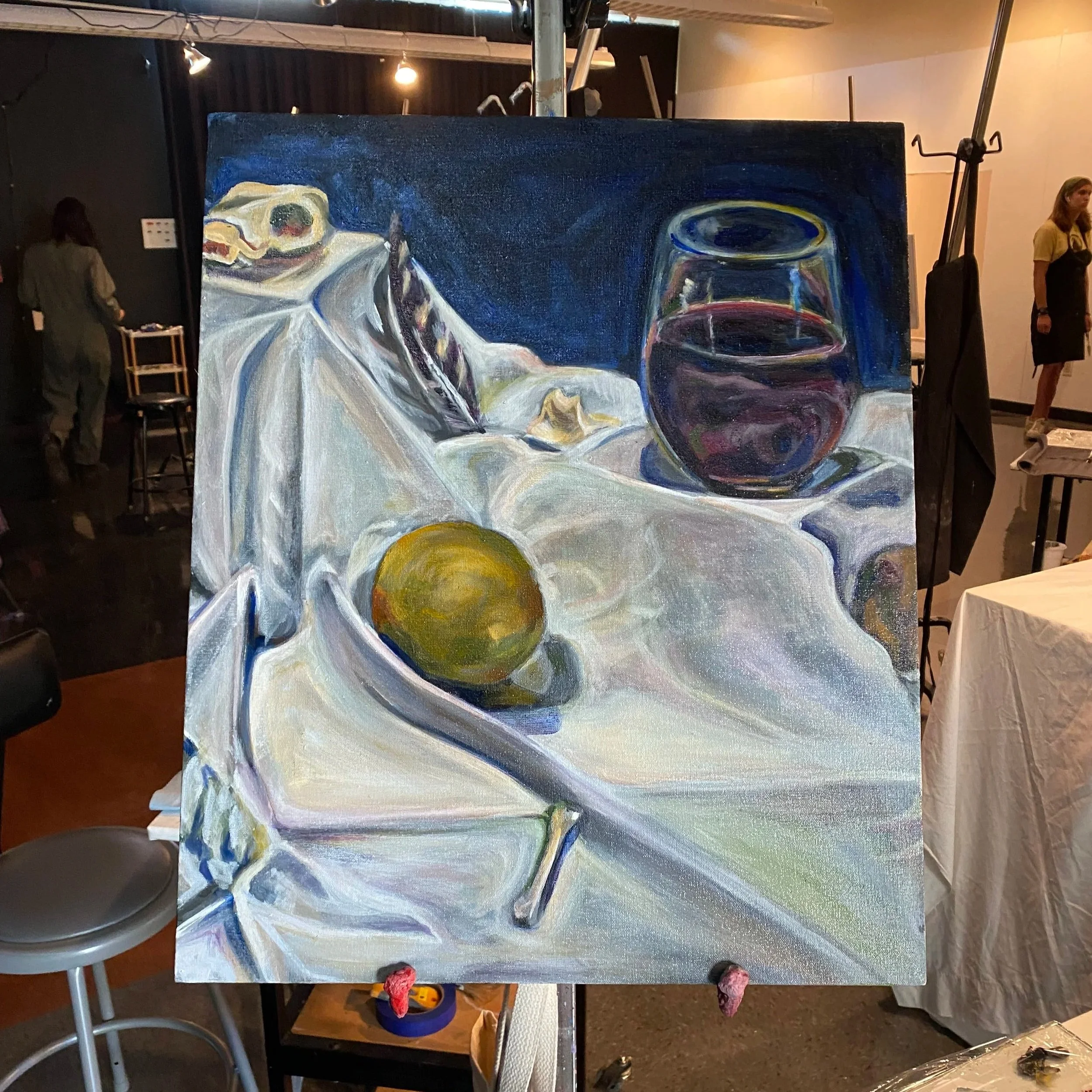 I remember one setup in particular: a glass of red wine sitting just off-center on a perfectly folded white sheet. But we didn’t use wine—we used grape juice, which started to mold after a couple of days under the lights. Every morning before I could start painting again, I had to quietly swap in a new glass, trying to match the original color and placement. It felt like I spent more time managing the illusion than I did making the painting.