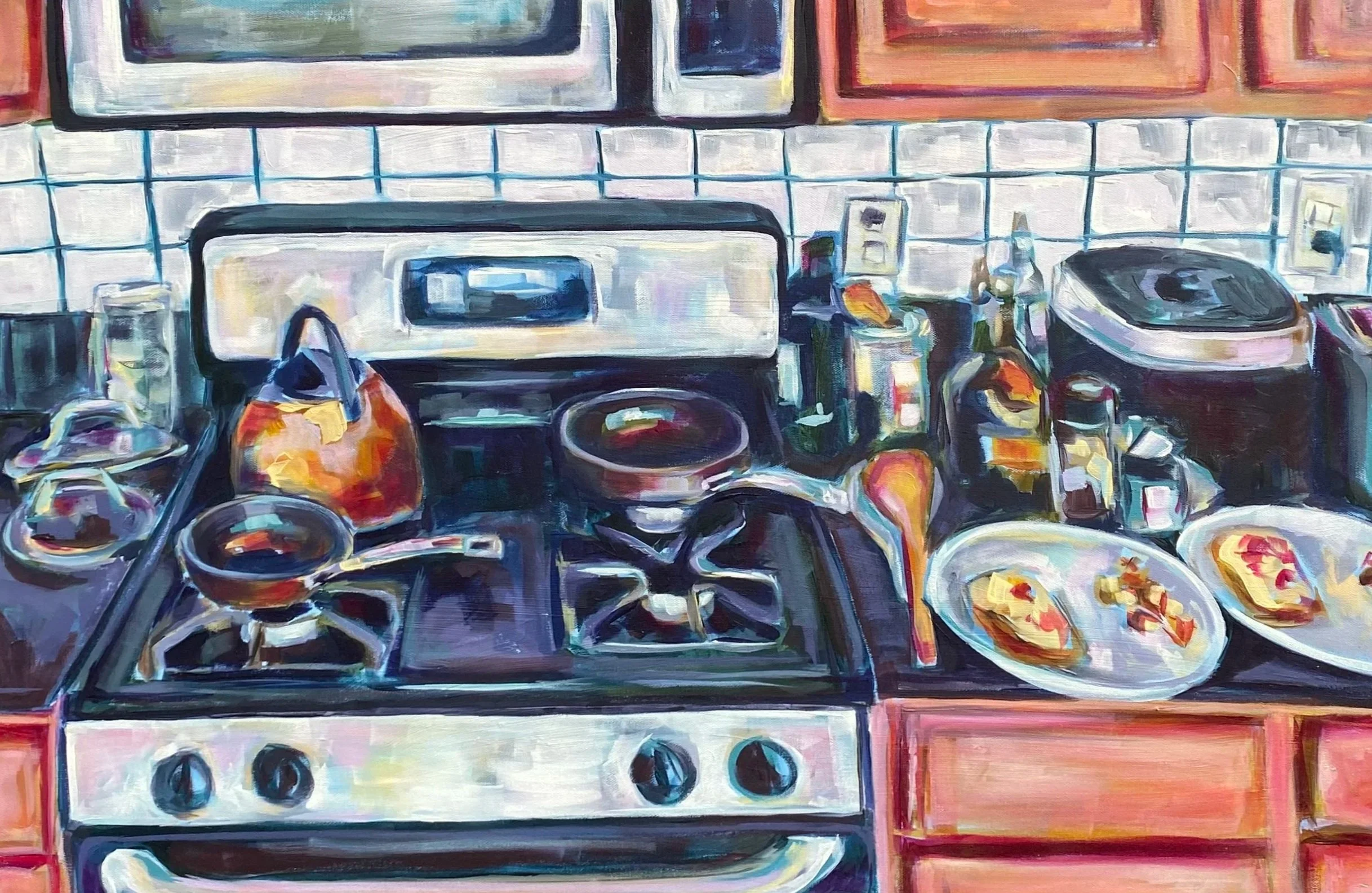 So I leave the dishes in the sink. I let the crumbs stay on the counter. I paint around the chaos—or directly through it. Because I’m not trying to make an image of how life should look. I’m trying to paint how it actually feels.