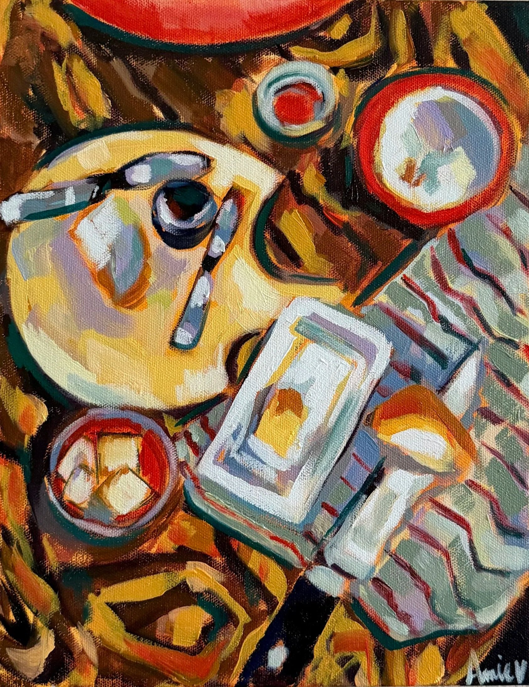 Painted from a quick photograph taken at the end of the night, the composition is built from half-eaten bites and overlooked details. These remnants form unexpected shapes and rhythms, transforming an ordinary scene into something intimate and familiar. The piece reflects an interest in everyday rituals and the subtle beauty found in moments often passed over.