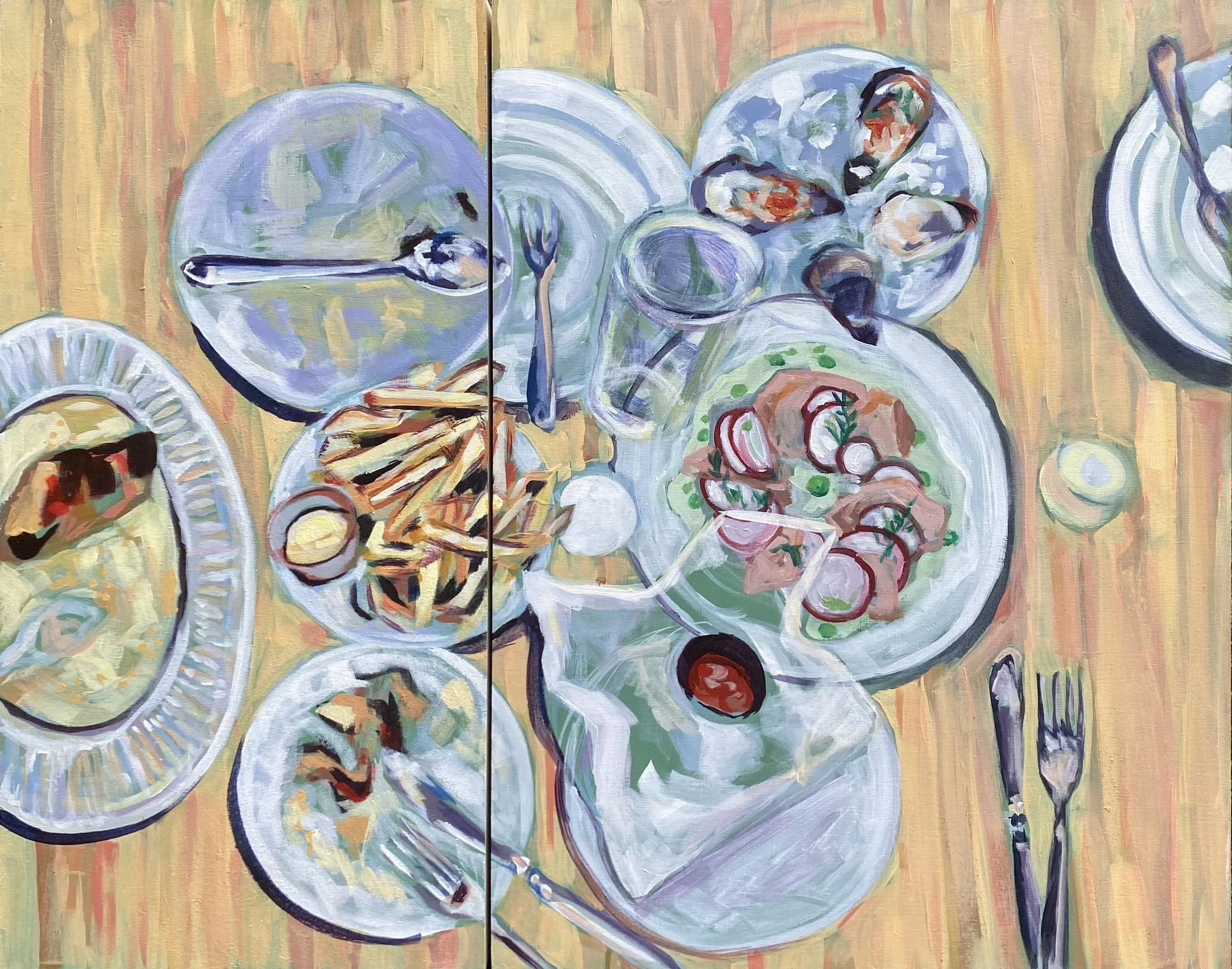 Roe captures a still life in motion—a chaotic, intimate arrangement of half-eaten plates and dirty dishes. Painted with expressive brushstrokes and layered gestures, the work resists the traditional stillness of still life, instead focusing on the during—the act of consuming, sharing, and existing together in a moment.