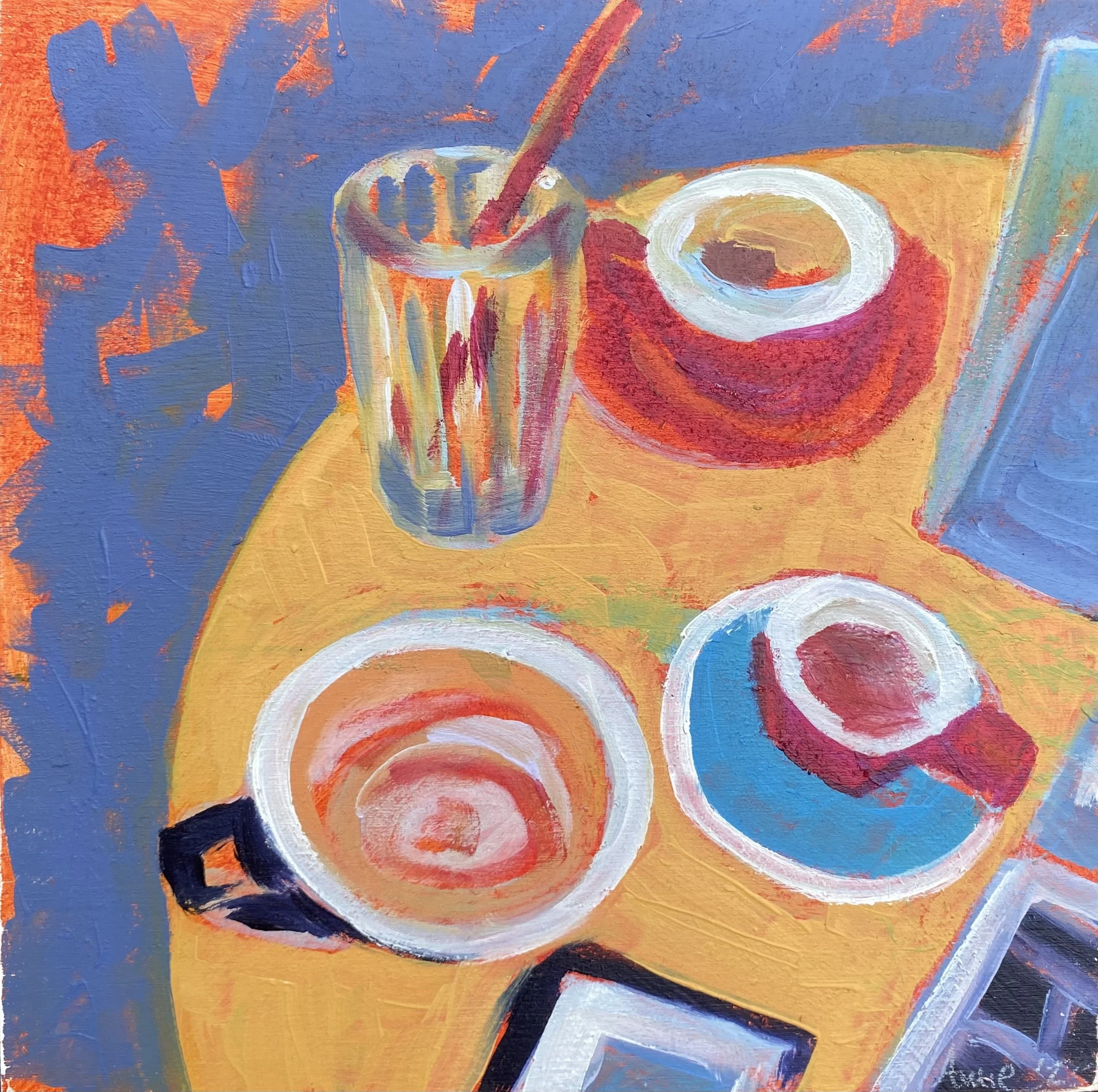 Still Life 2 is a small painting made from a moment during a study date at a coffee shop. The table was cluttered with a laptop, calculator, phone, and scattered cups—some full, some emptied or abandoned mid-sip.