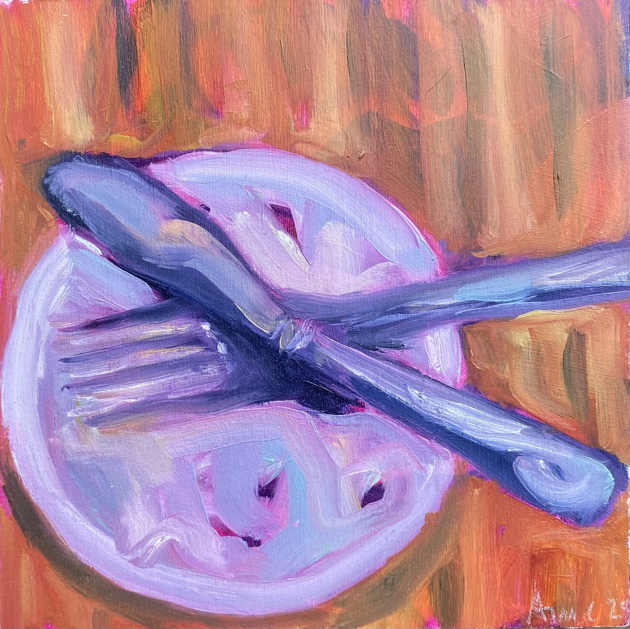 Still Life #5 is a small painting with a loose, gestural approach. I started with a bright magenta underpainting, letting it peek through the layers to bring a sense of life to the scene. An empty plate sits at the center, with a fork and knife resting casually on top—evidence of something recently finished.