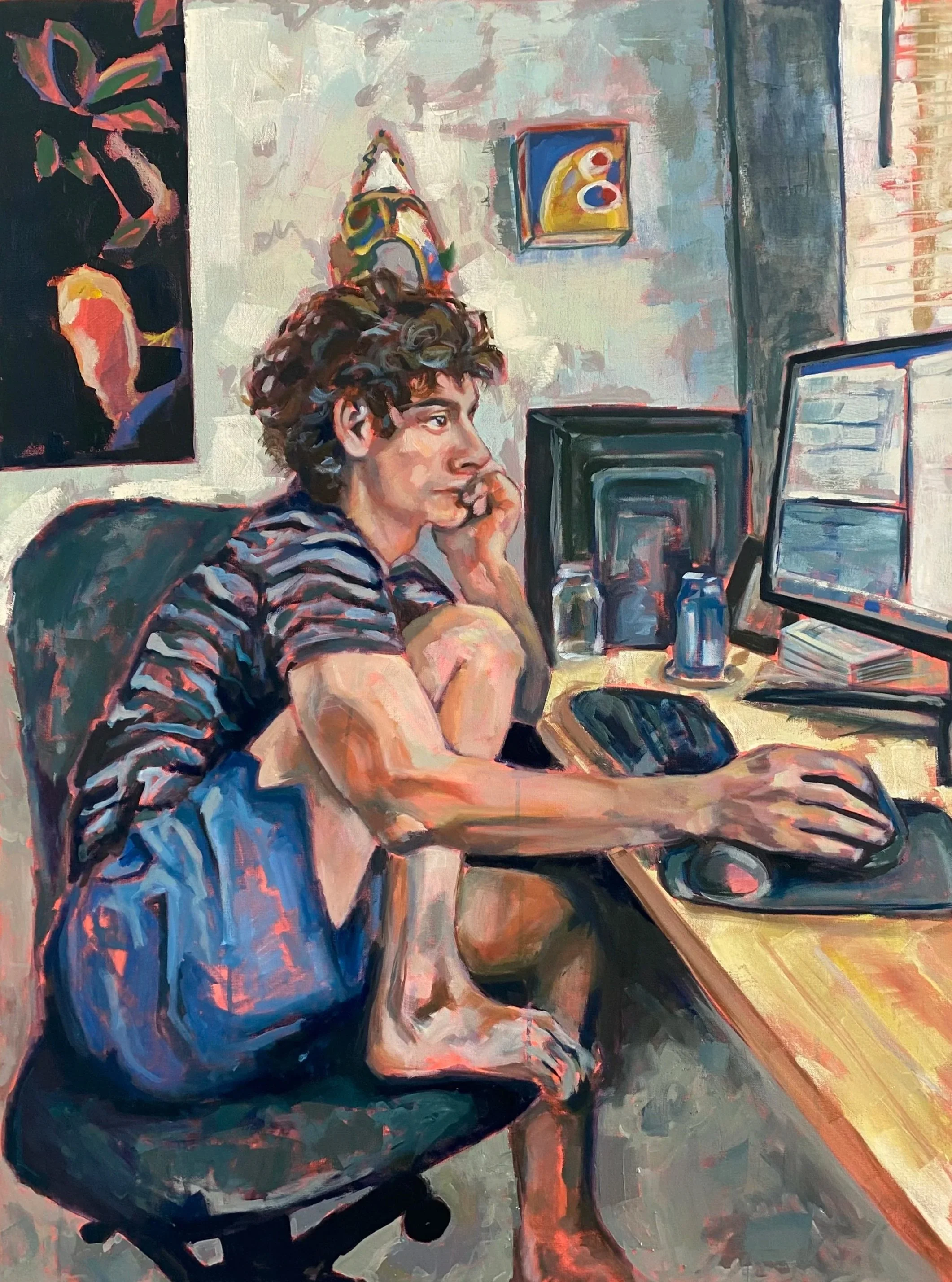 Studio Mate is a quiet observation—a quick glance across the room, a pause in my own work to take in someone else's way of being. This piece began as a simple moment: noticing the odd, endearing way the person I share my studio with sits at his desk. The way he folds into his work, completely focused, as if I'm not even there.