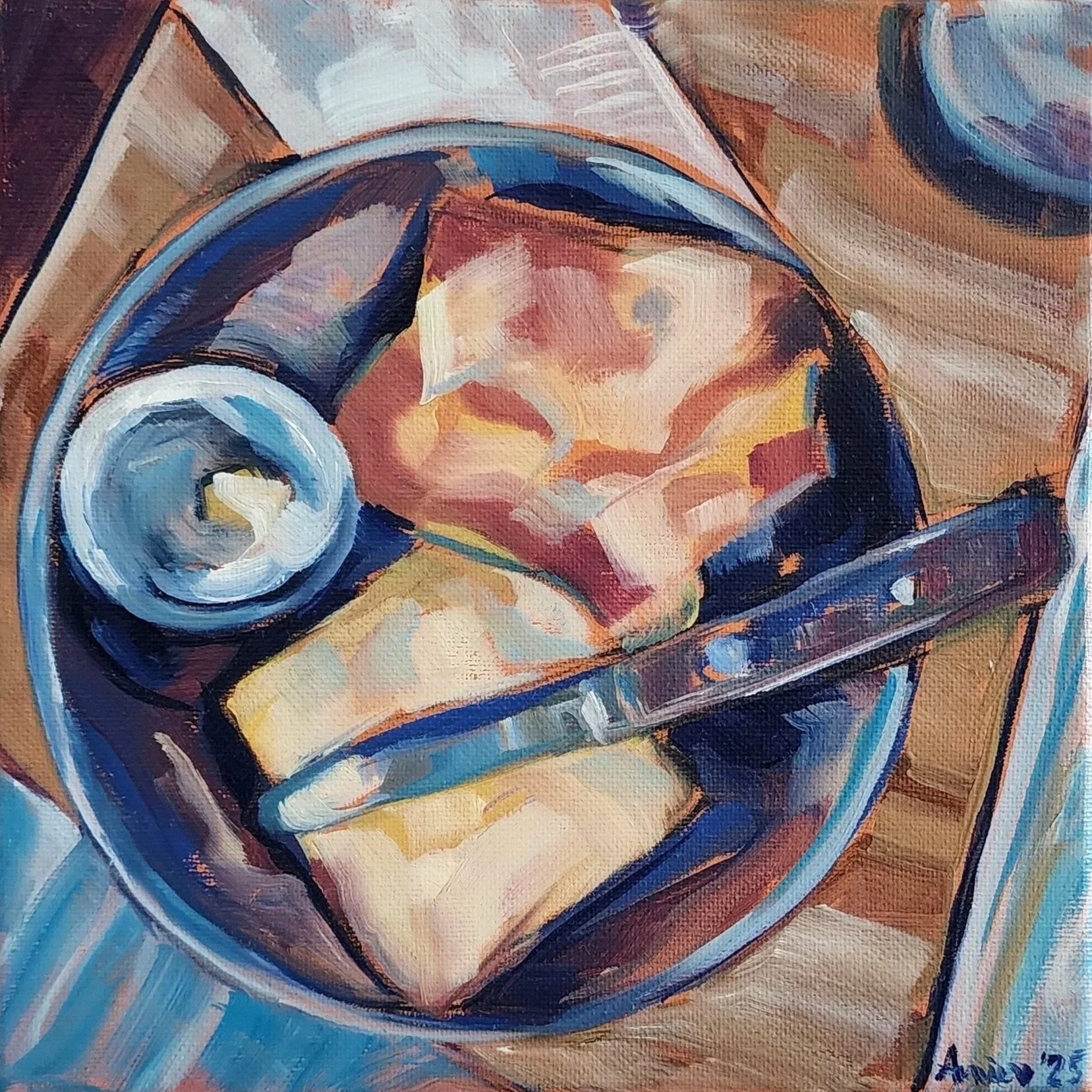 Like many of my still life studies, this piece isn’t about idealizing food—it’s about noticing it. It’s a quiet record of a moment: not plated or posed, just how it looked while I was eating it. There’s no deeper meaning, really—just a biscuit, halfway gone, painted with care.