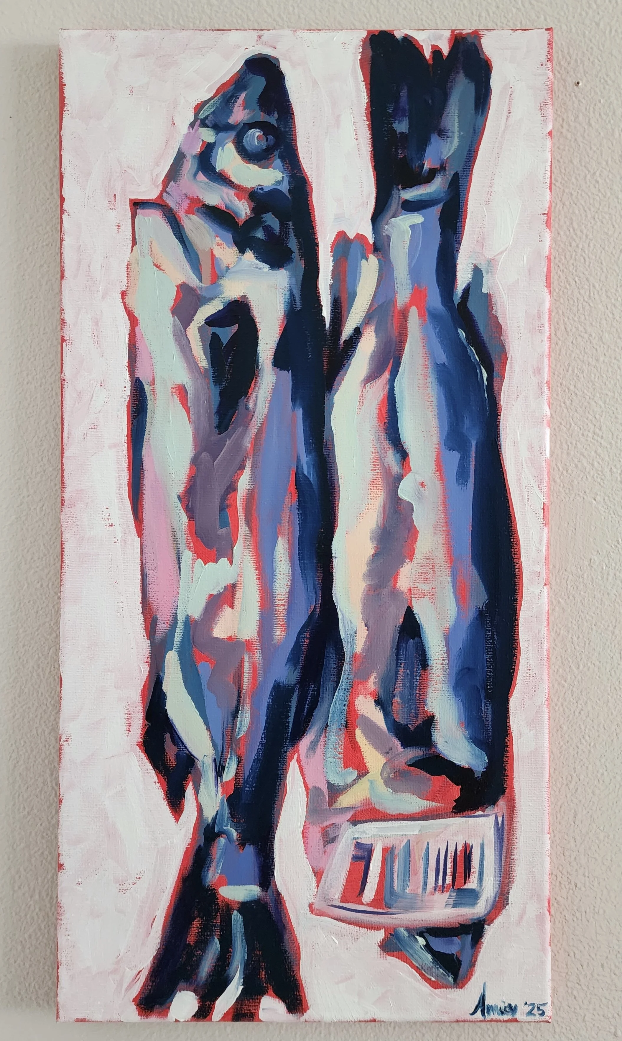 Study of Two Dead Fish is a 10x20 inch oil painting based on a package of grocery store fish—two shiny, lifeless bodies laid out in a styrofoam tray. Painted on a bright red underpainting, the image glows with unexpected color: purples, blues, greens, and pinks flicker across the slick surfaces of the fish, giving them an almost luminous quality.