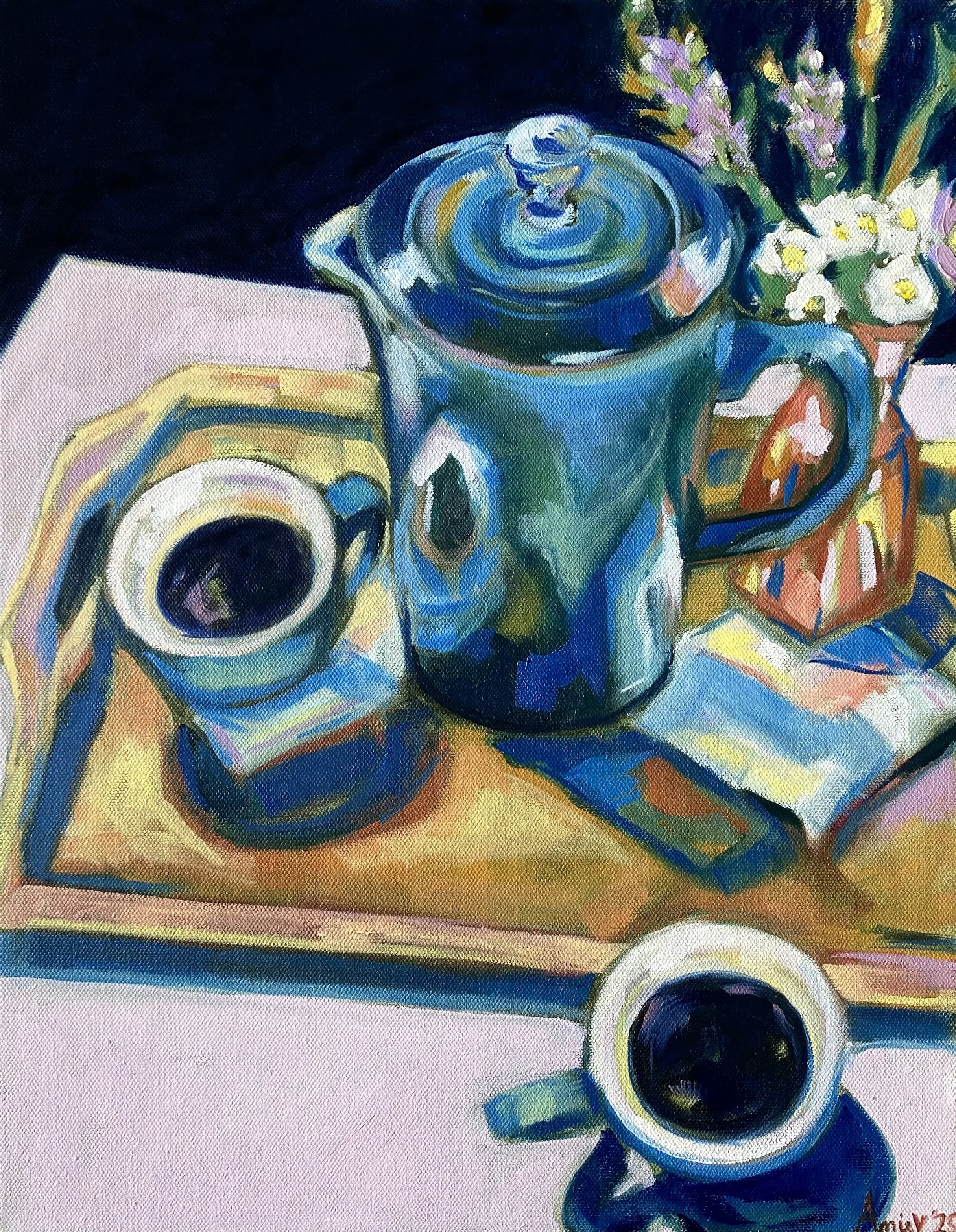 This painting shows a French press, two cups of coffee, and a small vase of flowers—captured at Cafe Blue in Fairhaven. It’s a cozy, welcoming spot, and this scene was taken just as it was. Nothing arranged or planned—just a quiet table on a slow day.
