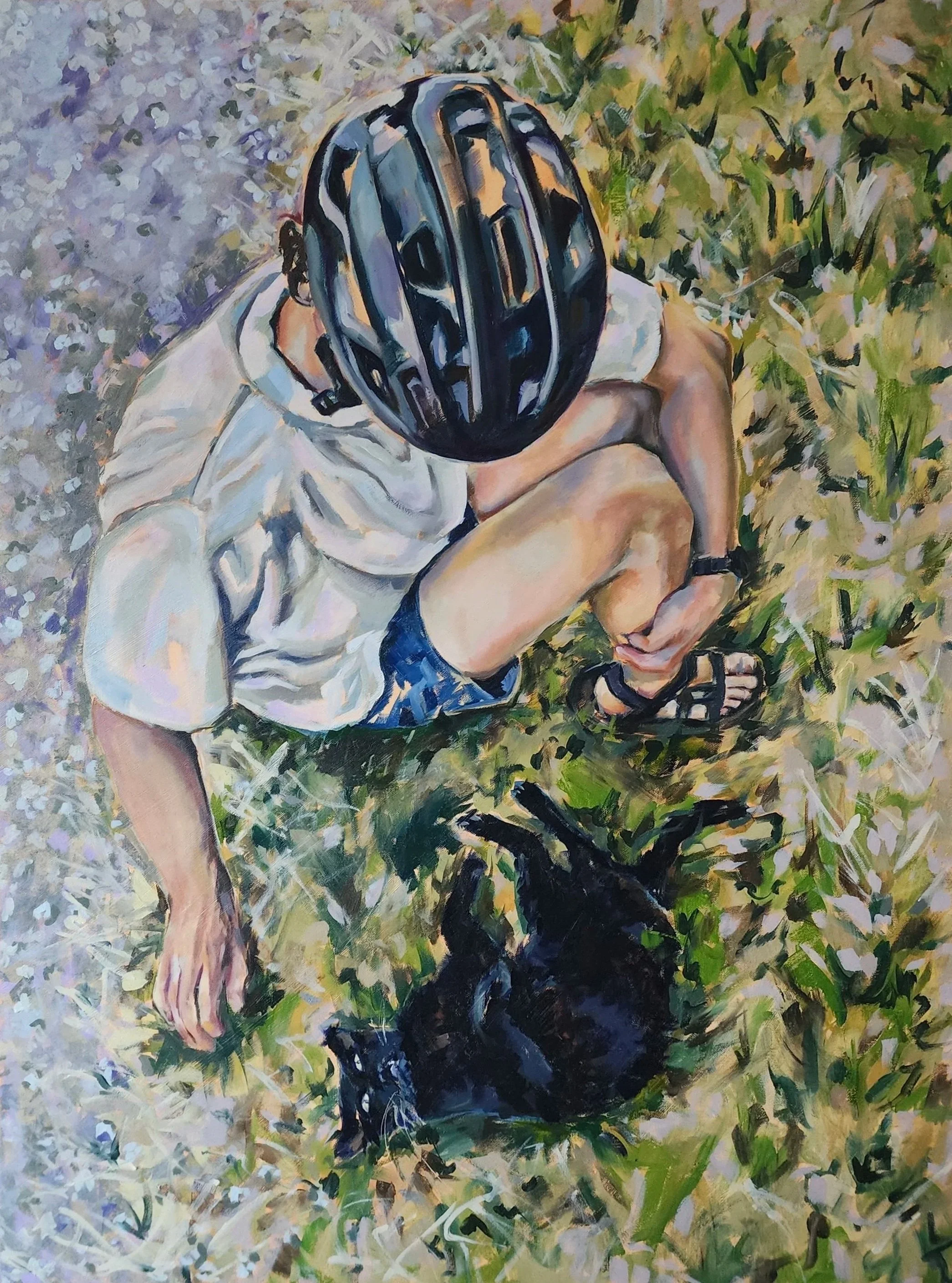 I painted this from a photo I snapped mid-interaction: helmet still on, bike just out of frame, the cat in full chaotic energy. The palette leans into purples and greens—grass, gravel, sunlight, movement—trying to hold that feeling of surprise and softness all at once.