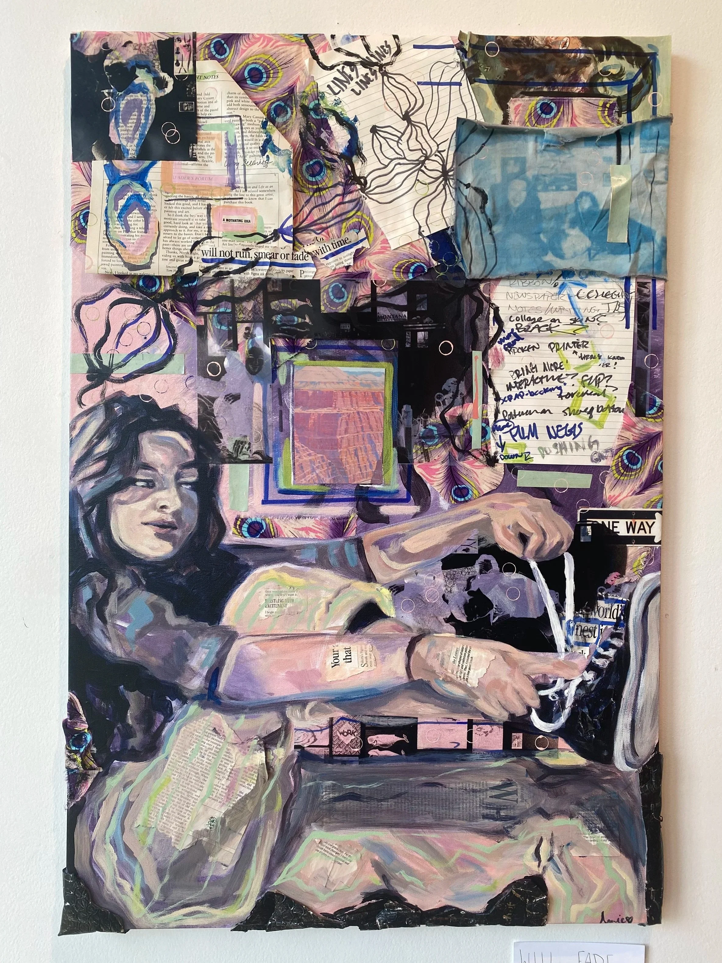 Across the surface, collage elements and anti-aging slogans—including the phrase “never fading with time,” from which the title is drawn—interrupt the image of a woman simply trying to exist. The result is a frustrated self-portrait—one that doesn’t aim to resolve the tension, but to hold it.
