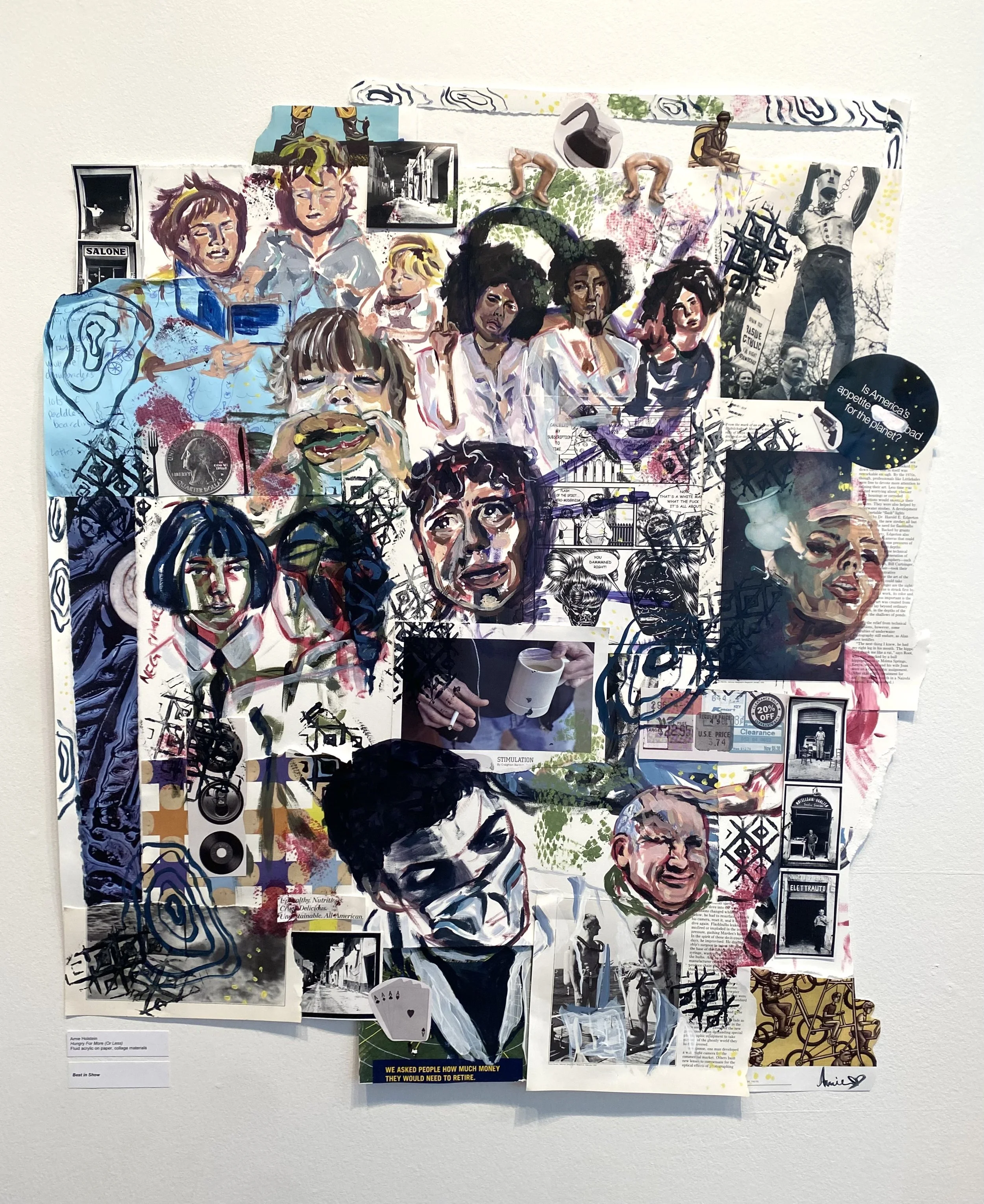 "hungry for more (or less)" is a layered portrait of contemporary consumption—chaotic, intimate, and unresolved. Painted in acrylic over collaged paper, the work weaves together fragments of faces and bodies. The materials—ripped magazine ads, packaging, glossy symbols of want—form a surface that is both seductive and unsettling.