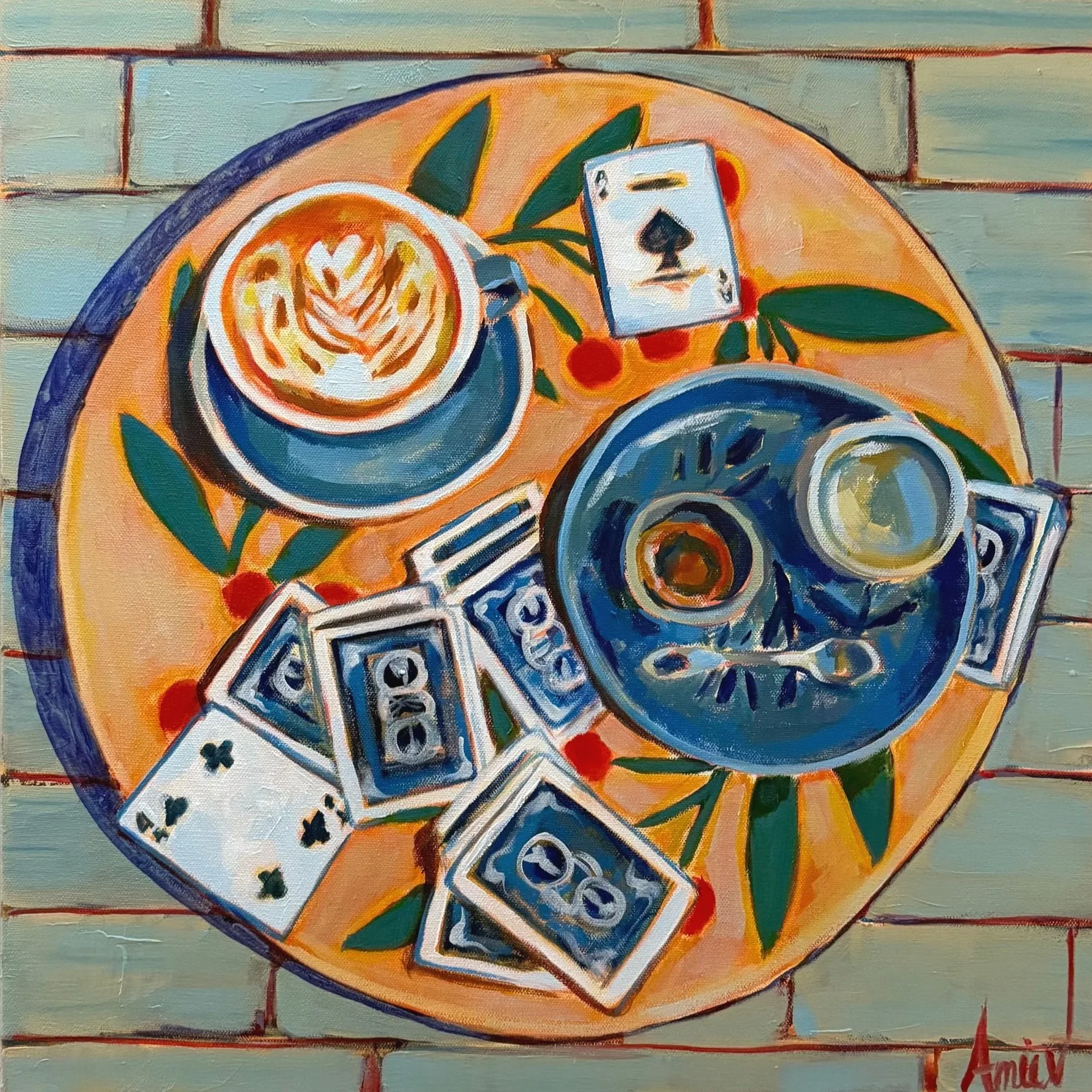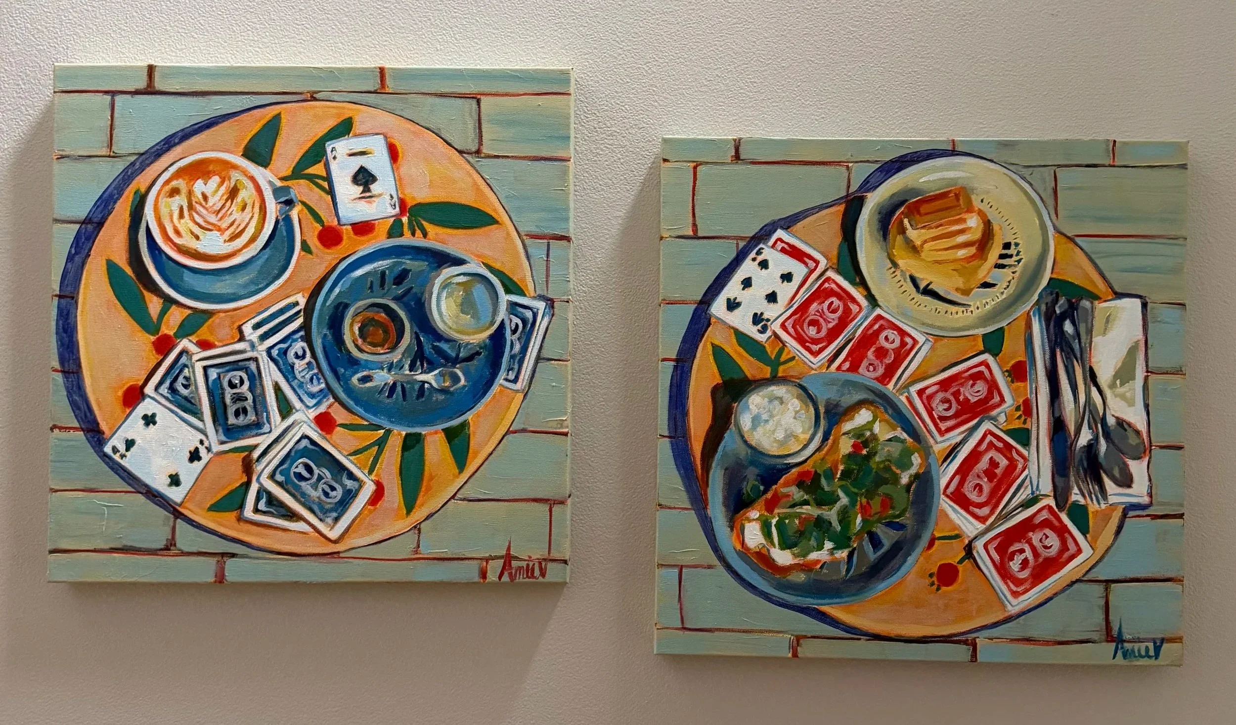 This diptych is based on a ritual Sean and I return to often: attempting to play double solitaire at one of our favorite coffee shops, even when the only available seating is two impossibly small tables next to each other in the corner.