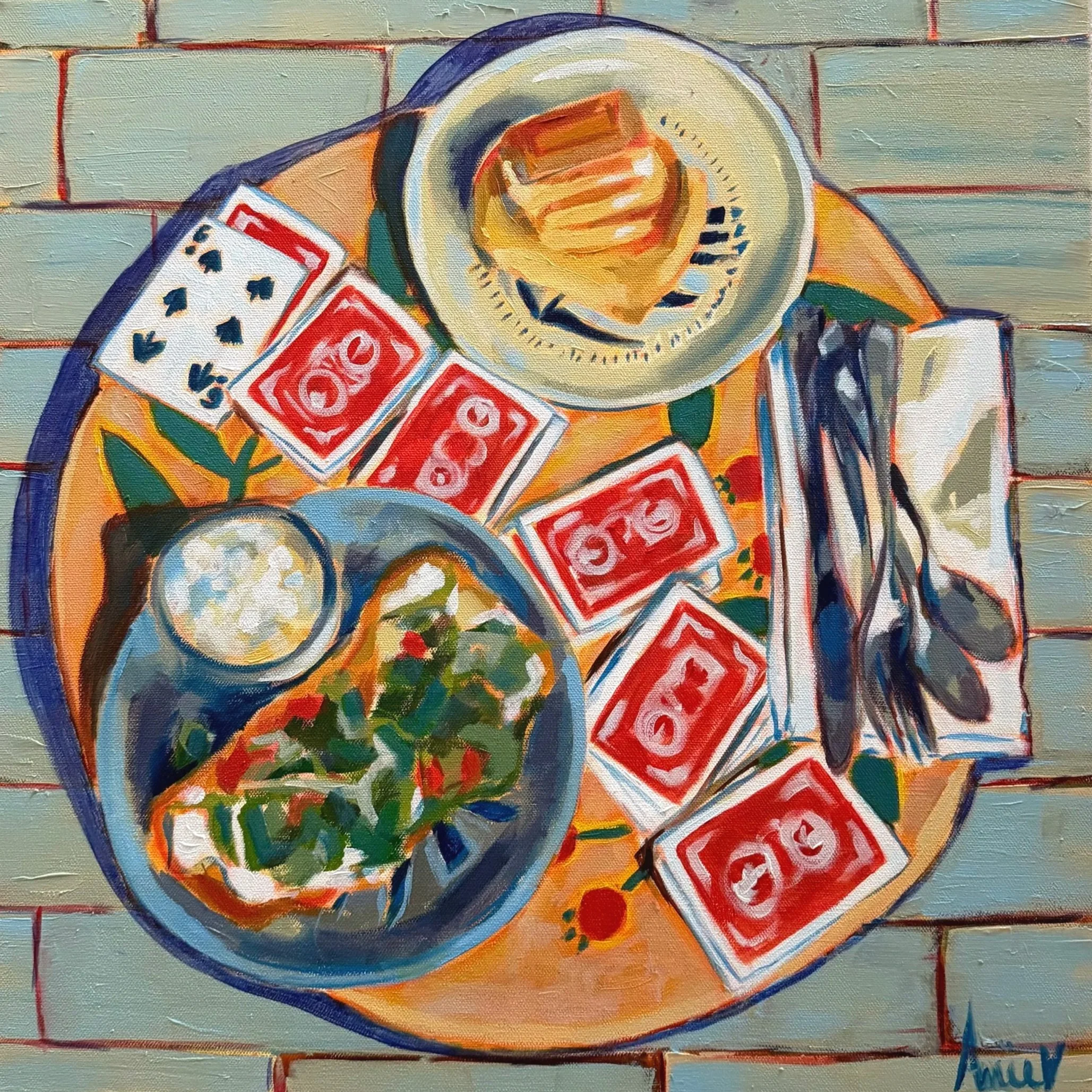 We carefully lay out the rows — red deck in one painting, blue in the other — negotiating inches of space and balancing cards along the edges. For a brief moment, it feels possible. Then our drinks arrive. Then the food. Slowly, the game collapses under the practical reality of cups, plates, and elbows knocking everything over.