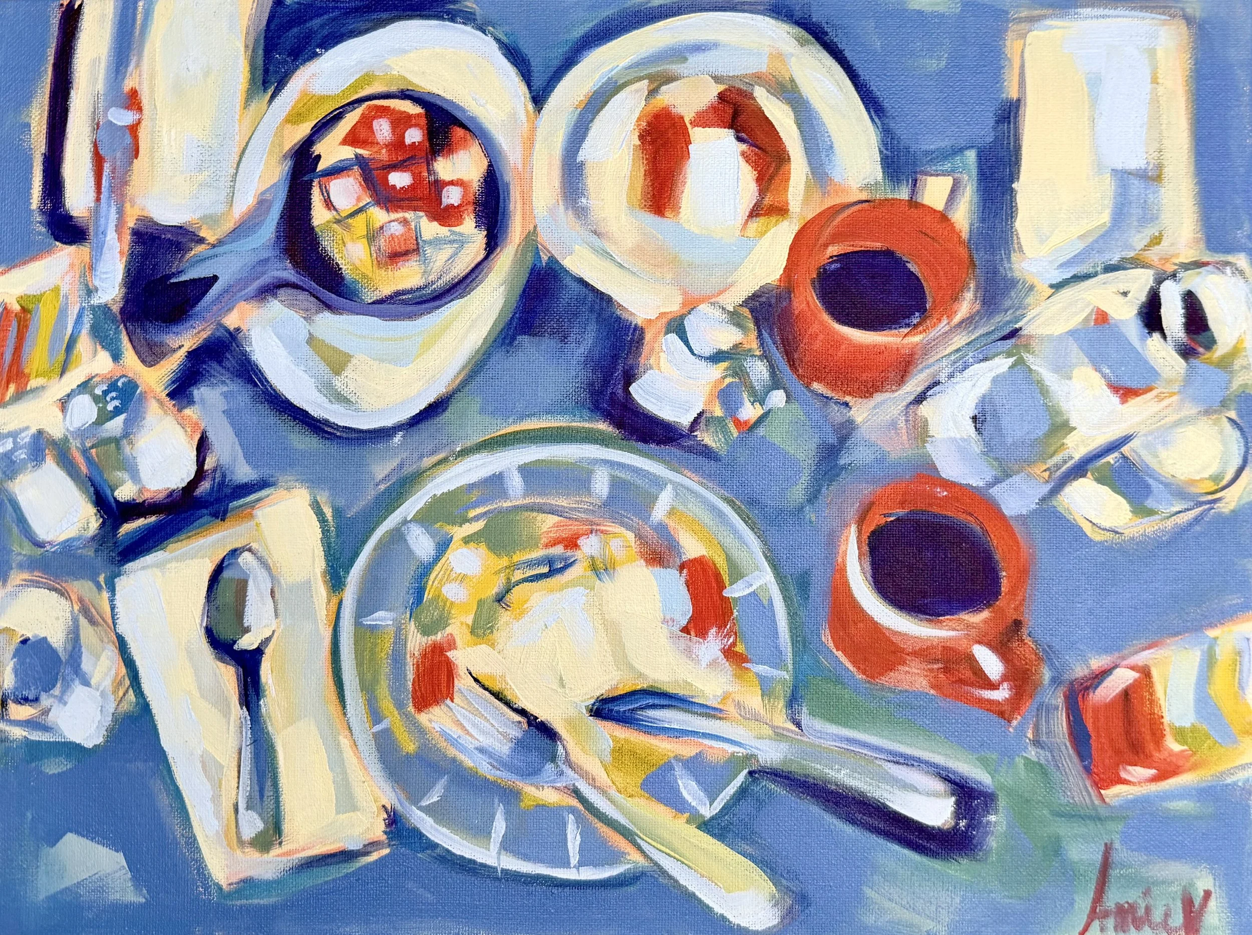 Together or Separate grew out of my ongoing fascination with diners as places of everyday connection. The title references that familiar moment when the waiter asks, “together or separate,” a simple question that quietly carries ideas about closeness, independence, and shared experience. I used layered color and loose, expressive brushwork to suggest the hum of conversation and the comfort of being together in a public place. Like many of my recent works, this piece reflects my interest in how food and shared spaces shape community and connection.