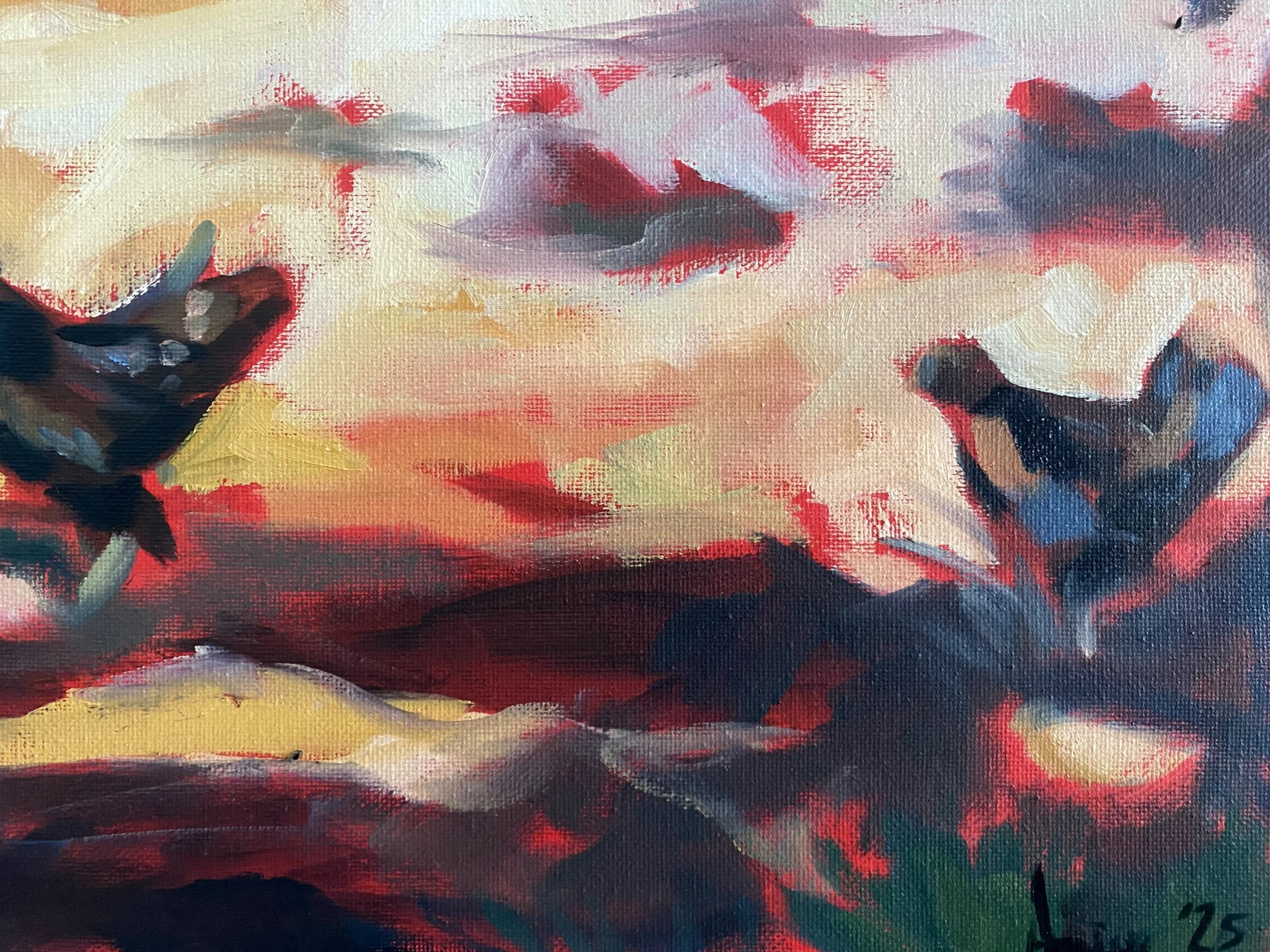 I began with a bold red underpainting, letting it peek through the layered blues and bright yellows. The loose, expressive brushwork holds onto the movement of the birds and the playful feeling of the moment.