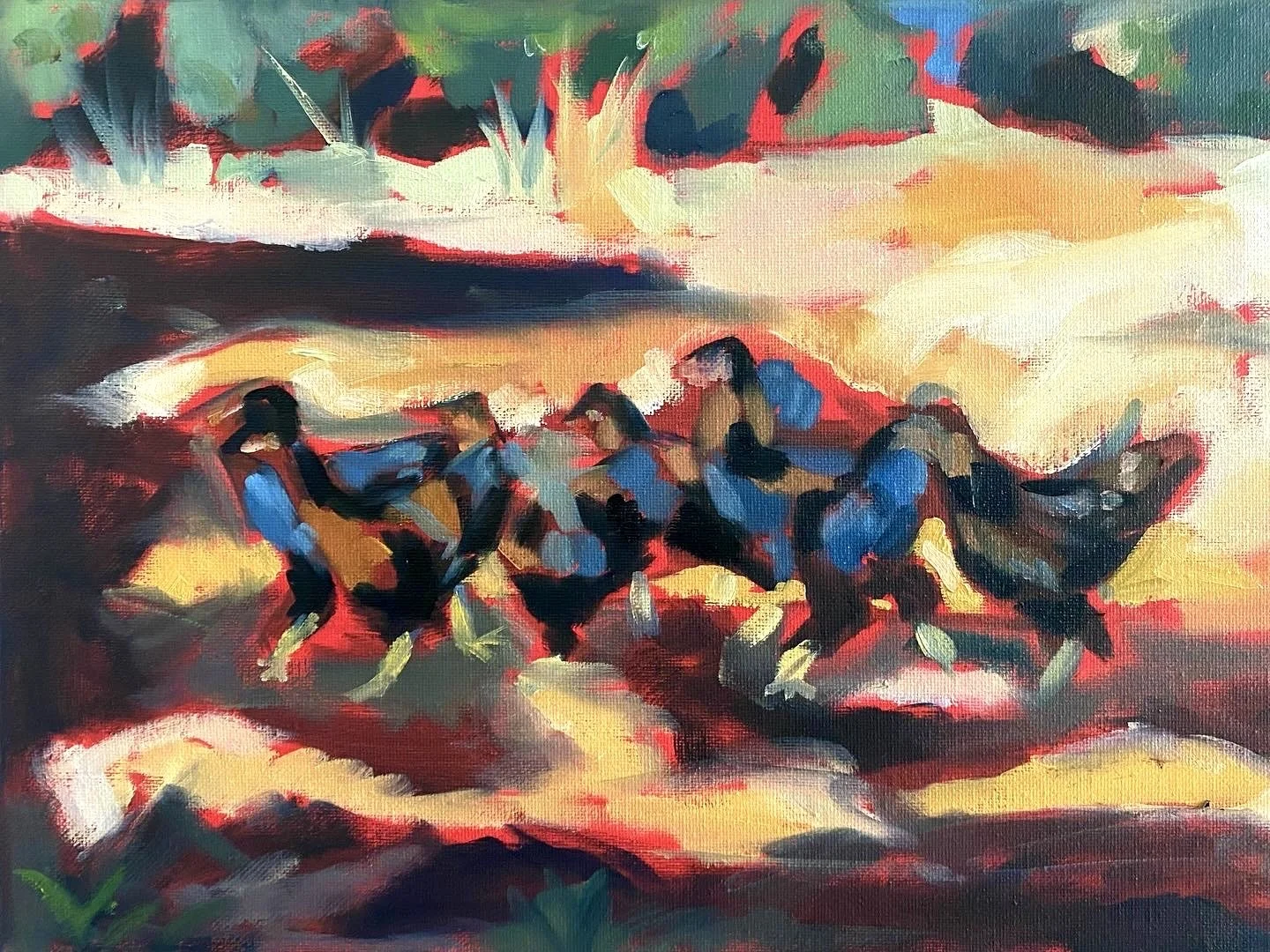 This painting came from a spontaneous moment while helping a friend move — I didn’t even know she had chickens until they came racing across the backyard. That quick, lively scramble stuck with me, and I wanted to capture the surprise and energy of it.